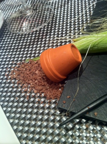土にみたてた岩塩の上に、プチトマトのさらに赤ちゃんのような小っちゃなトマト。